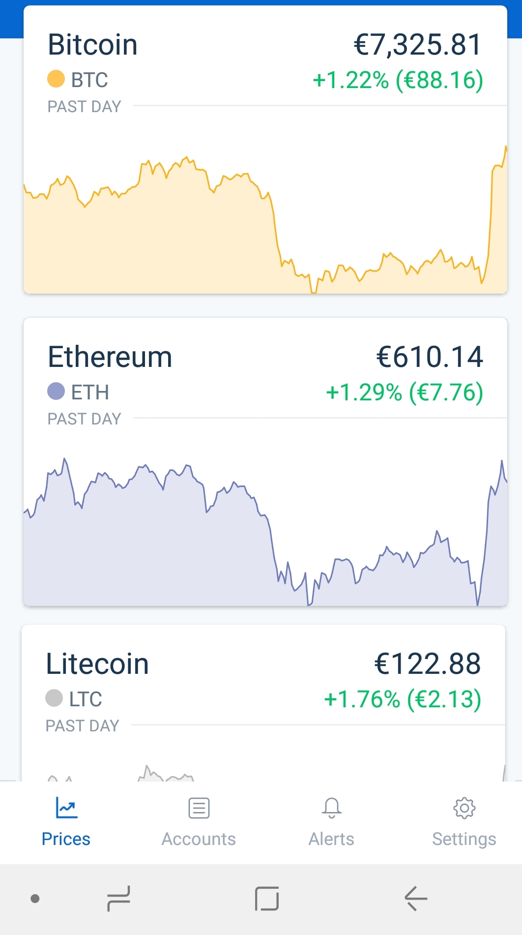 Esistono molte piattaforme che vendono Bitcoin e altre cryptovalute, io consiglio Coinbase, che ha i costi minori, ha un semplice sito e anche l’App per Android e iPhone. L’app permette di vedere anche in tempo reale il valore del tuo portafoglio, quindi non devi fare nessun calcolo. Nell’immagine invece potete vedere l’andamento l’andamento delle cryptovalute, si può sceglie l’intervallo di tempo, da 1 giorno a 5 anni.